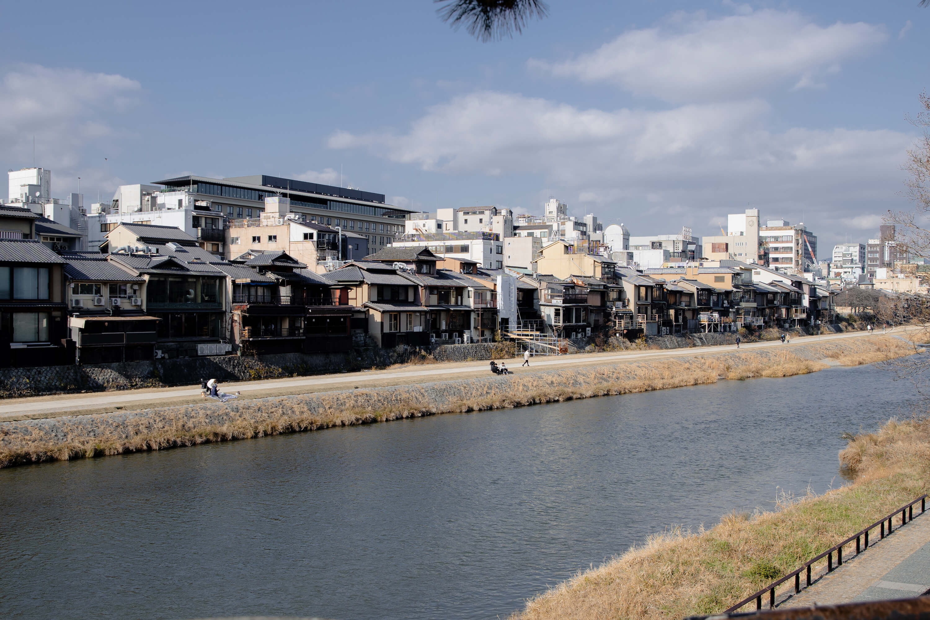 一出站便可以看到著名的鴨川,沿著鴨川有一整排的建築,在夏季時會有著名的鴨川納涼床,提供木材組裝的高床讓遊客可以在上面用餐、休憩、發呆欣賞鴨川。